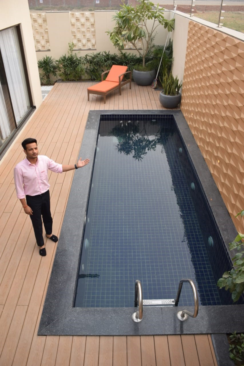 द गोल्डन एस्टेट कालोनी में भारतीय क्रिकेटर रिंकू सिंह के घर वीना पैलेस में स्वीमिंग पूल दिखाते ओजोन के निदेशक सागर मंगला। जागरण