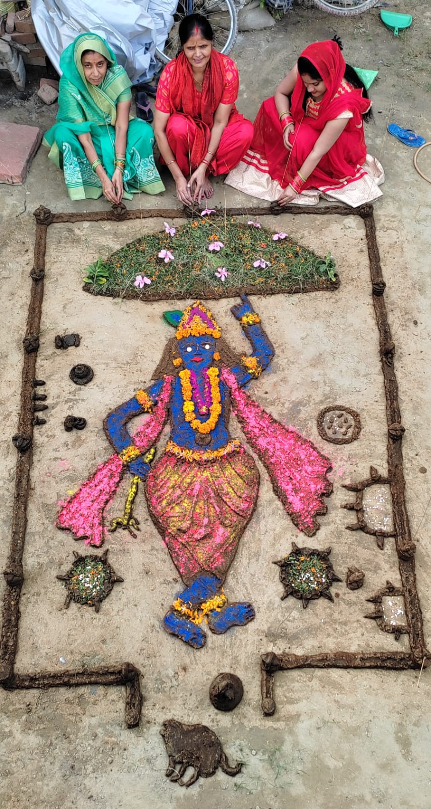 सुबह निर्धारित समय पर घरों में गोबर से गोवर्धन महाराज पधारने का सिलसिला शुरू हुआ। श्रद्धालुओं ने भगवान कृष्ण की गोवर्धन Govardhan उठाते हुए आकृति गोबर से बनाई। सजाने के लिए खीलों के अलावा सूखे रंगों का भी प्रयोग किया गया। आकृति को आकर्षक ढंग से सजाया गया। घरों के अलावा स्कूल, कालेज व मंदिरों पर भी कार्यक्रम हुए। घरों में परिवार के साथ और सार्वजनिक स्थानों पर लोगों ने मिलकर गोवर्धन महाराज की परिक्रमा करते हुए गीत गाए। इसके बाद जगह-जगह प्रसाद का वितरण भी किया गया।