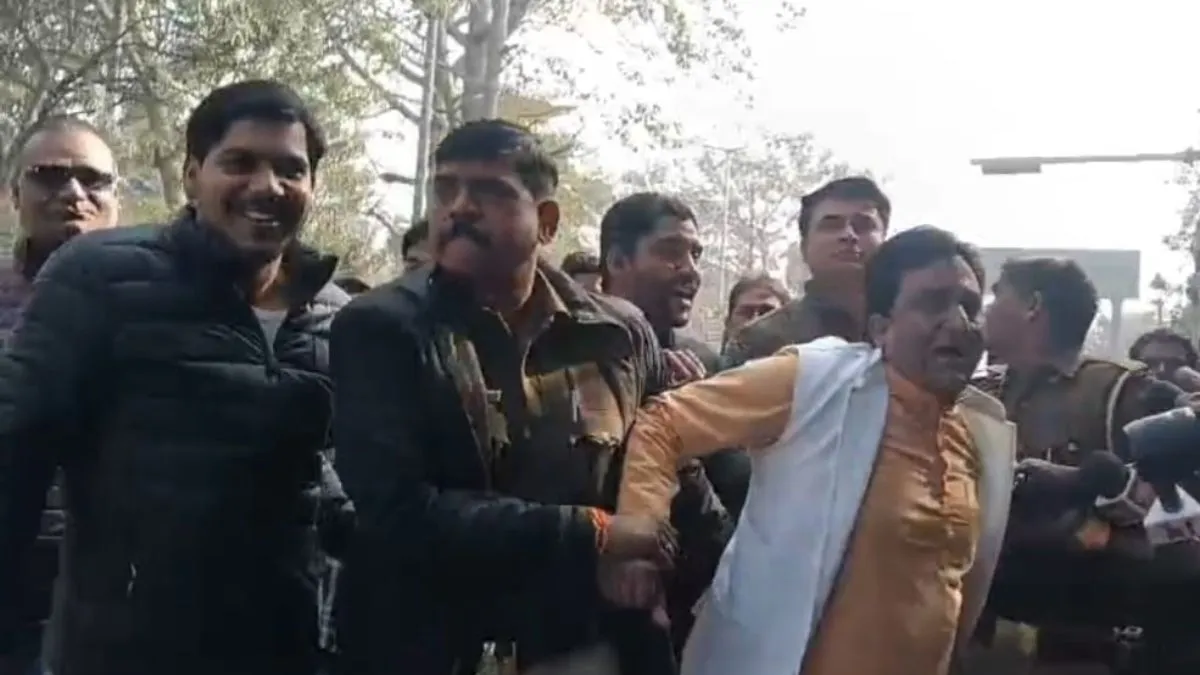 सांसद चंद्रशेखर को धमकी देने के आरोपी नेता को गिरफ्तार कर ले जाती पुलिस।