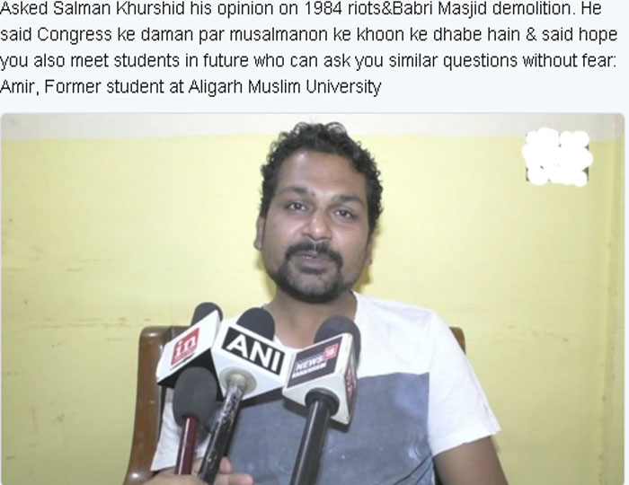 छात्र आमिर मिंटोई ने खुर्शीद से दंगों और बाबरी मस्जिद पर सवाल किया तो आयोजकों ने छात्र को रोकने की कोशिश की, लेकिन सलमान खुर्शीद ने कहा कि इन्हें सवाल करने दीजिए। हालांकि राजनीतिक प्रश्न है। इसके बाद छात्र ने सवाल किया कि 1948 में एएमयू एक्ट में पहला संशोधन हुआ। उसके बाद 1950 में प्रेसिडेंशल ऑर्डर जिसमें मुस्लिम दलितों से एसटी/एससी आरक्षण का हक छीना गया।