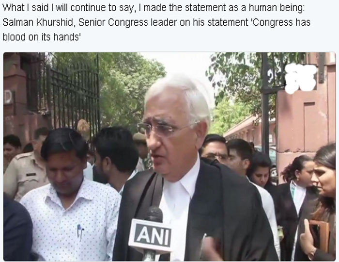 सलमान खुर्शीद ने कह दिया कि कांग्रेस के दामन पर मुसलमानों के खून के दाग लगे हैं। मैं कांग्रेस का नेता हूं। इस नाते मुसलमानों के ख़ून के यह धब्बे मेरे अपने दामन पर भी हैं।