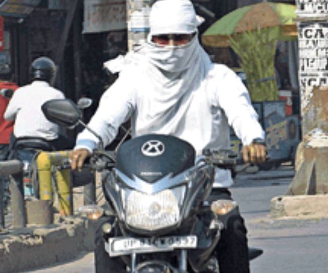 तेज धूप में मुंह ढंककर बाइक से जाता युवक। जागरण