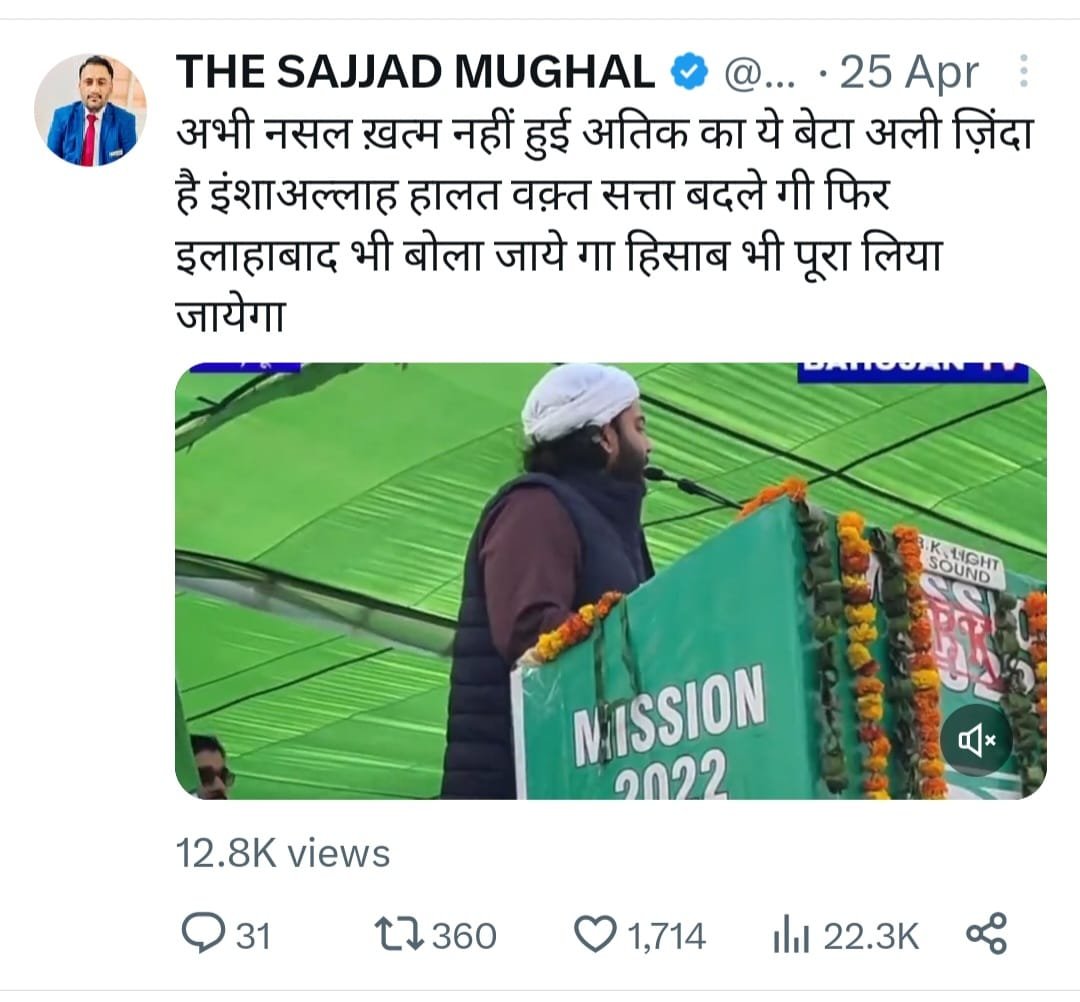 इस यूजर ने सोशल मीडिया अकाउंट पर लिखा- "अभी नसल खत्म नहीं हुई अतीक का बेटा अली अभी जिंदा है। इंशाअल्लाह हालत, वक्त और सत्ता बदलेगी फिर इलाहाबाद भी लिया जाएगा और हिसाब भी पूरा किया जाएगा।" इस ट्वीट के साथ अतीक के बेटे अली का फोटो भी अपलोड किया गया है।