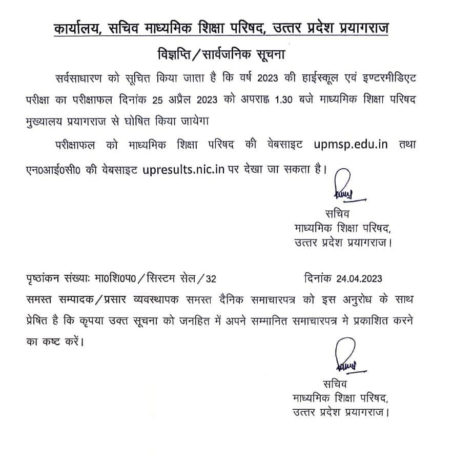 Live UP Board 10 and 12th Result 2023 Latest News कल (मंगलवार) दोपहर 1.30 बजे यूपी बोर्ड मुख्यालय प्रयागराज से हाई स्कूल और इंटर का एक साथ घोषित किया जायेगा रिजल्ट। यूपी बोर्ड सचिव दिब्यकांत शुक्ल ने पुष्टि की।