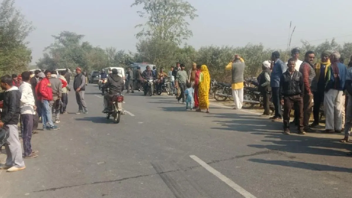 घटनास्थल के पास सड़क किनारे खड़े ग्रामीण व राहगीर।
