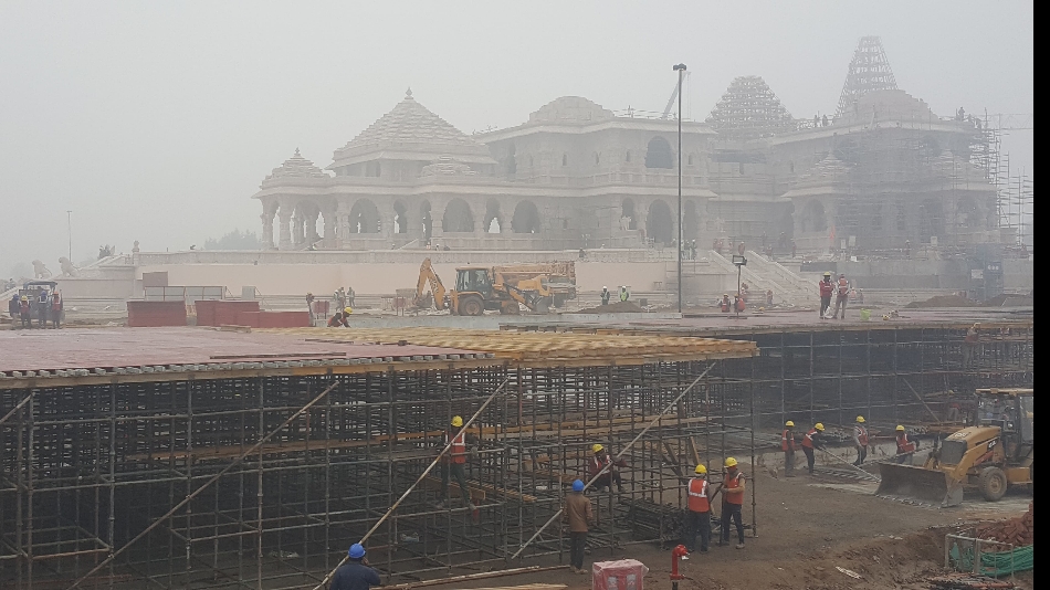 श्रीरामजन्मभूमि परिसर में रामलला की प्रतिमा के प्राण प्रतिष्ठा की तैयारी और मंच बनाते लोग: ट्रस्ट