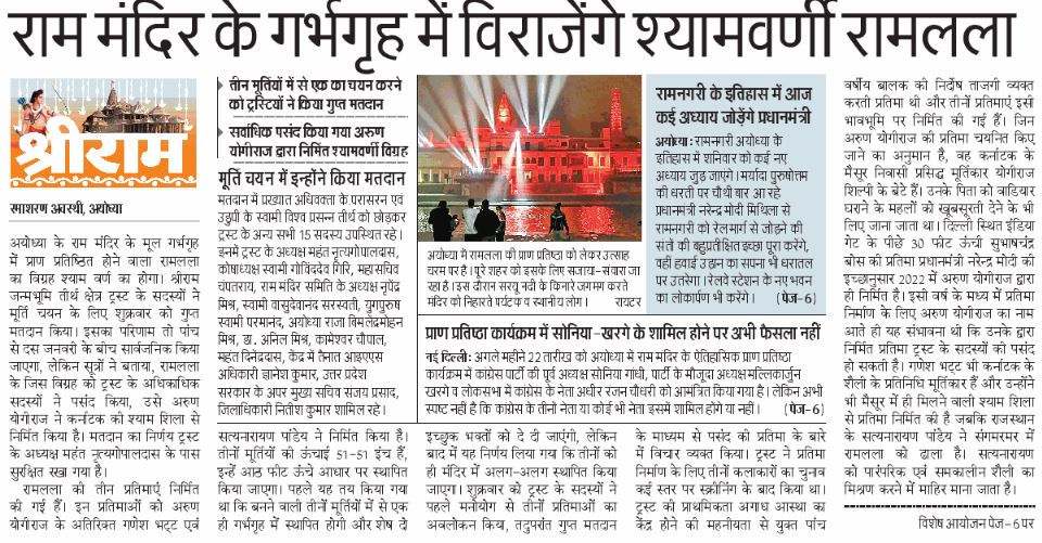 दैनिक जागरण ने अपने सूत्रों के माध्यम से 30 दिसंबर के अंक में बता दिया था कि योगीराज द्वारा निर्मित श्यामवर्ण की प्रतिमा को ही नवनिर्मित मंदिर में स्थापित किया जाएगा।