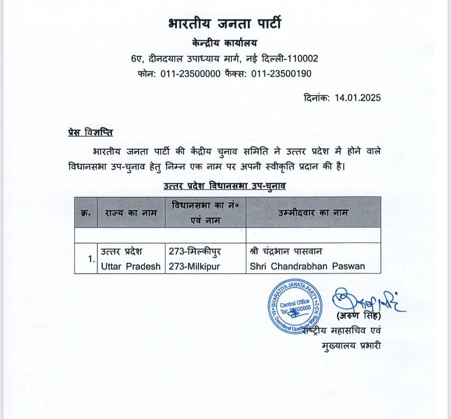डिजिटल डेस्क, नई दिल्ली। Milkipur Assembly by-election: मिल्कीपुर विधानसभा के उपचुनाव के लिए भाजपा ने अपने पत्ते खोल दिए हैं। पार्टी ने चंद्रभान पासवान को अपना उम्मीदवार बनाया है। इसके संबंध में भारतीय जनता पार्टी के केंद्रीय कार्यालय से प्रेस विज्ञप्ति जारी की गई है।