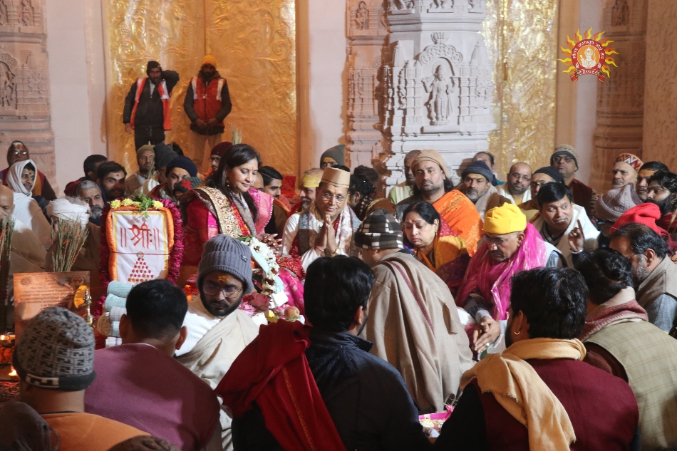 राममंदिर के गर्भगृह में वेदी पर पूजन करते यजमान डा. अनिल मिश्र व उनकी पत्नी ऊषा मिश्रा: सौ.से श्रीरामजन्मभूमि तीर्थक्षेत्र ट्रस्ट