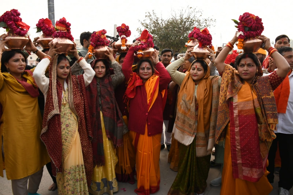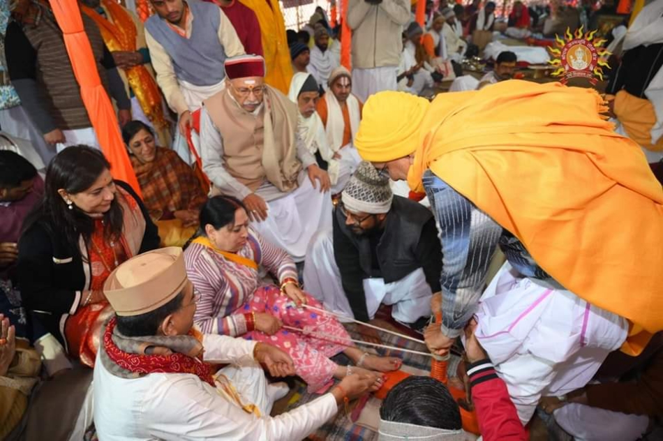 यजमान ने पंचगव्य का प्राशन (चख) कर व्रत आरंभ किया। रामघाट स्थित विवेक सृष्टि में शिल्पकार अरुण योगीराज का पूजन कर मूर्ति को प्राप्त की गई। भगवान विष्णु व कर्मकुटी पूजन के पश्चात हवन हुआ। वैदिक परंपरा के अनुरूप ही भगवान के नेत्रों पर पट्टी बांधी गई।