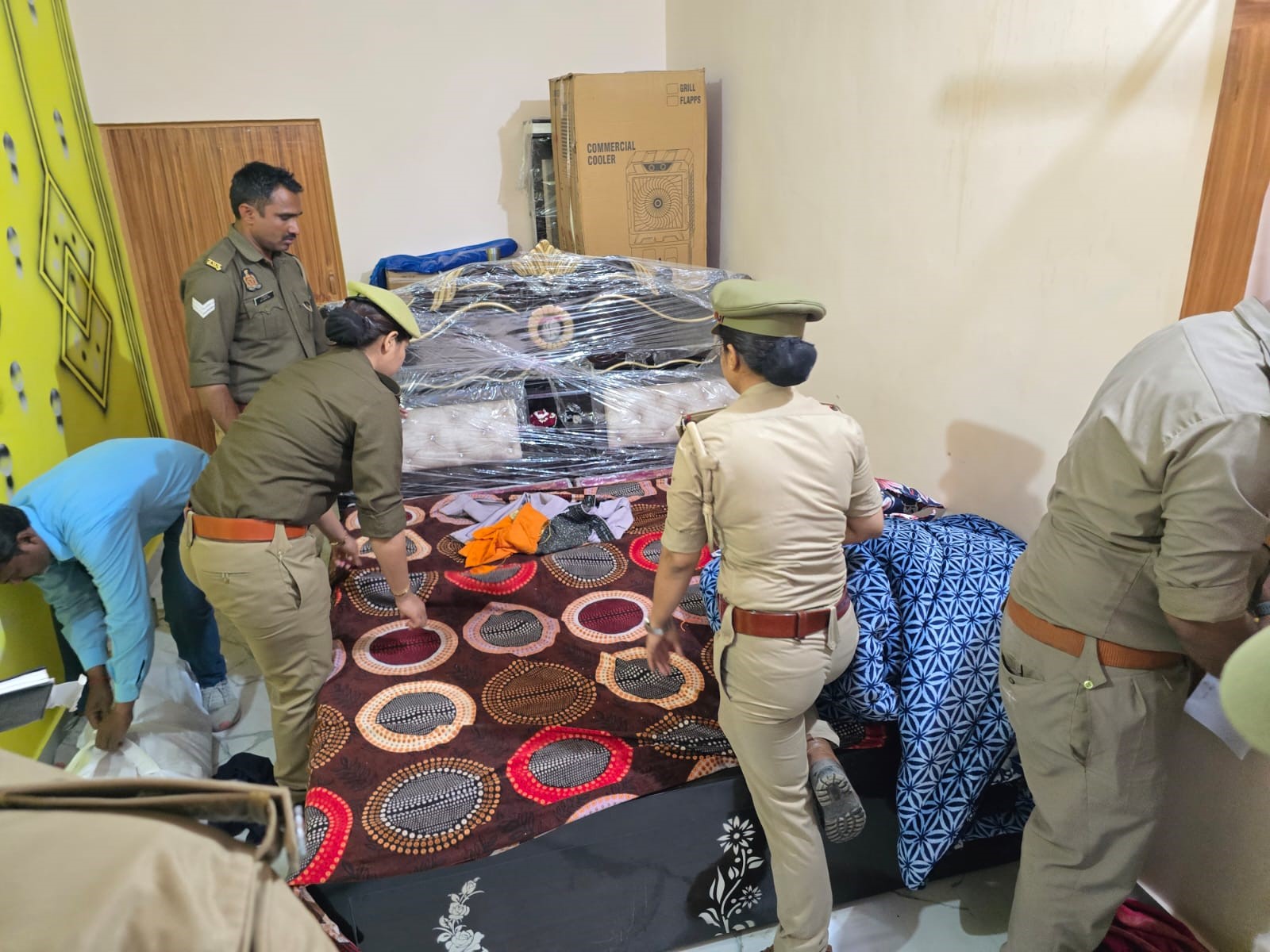 मृतक के आवास पर छानबीन करते पुलिसकर्मी : जागरण