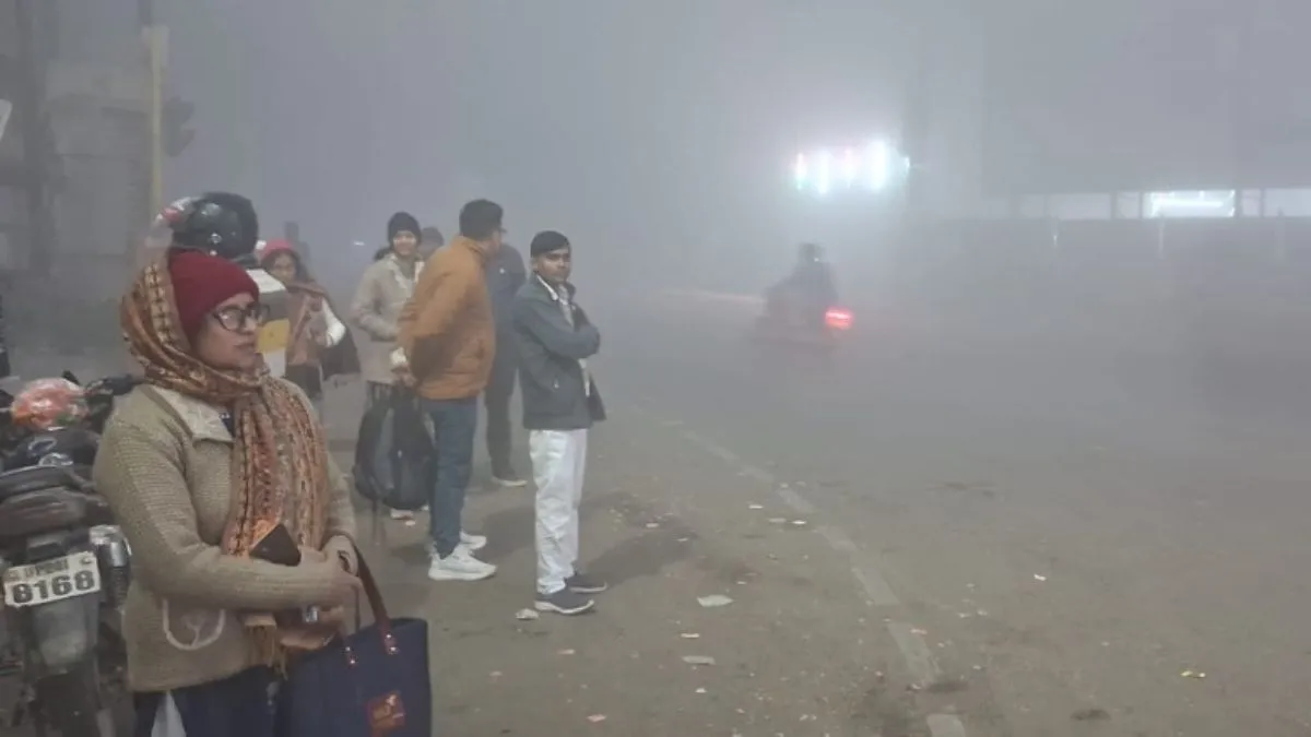 घने कोहरे के बीच वाहन का इंतजार करते लोग