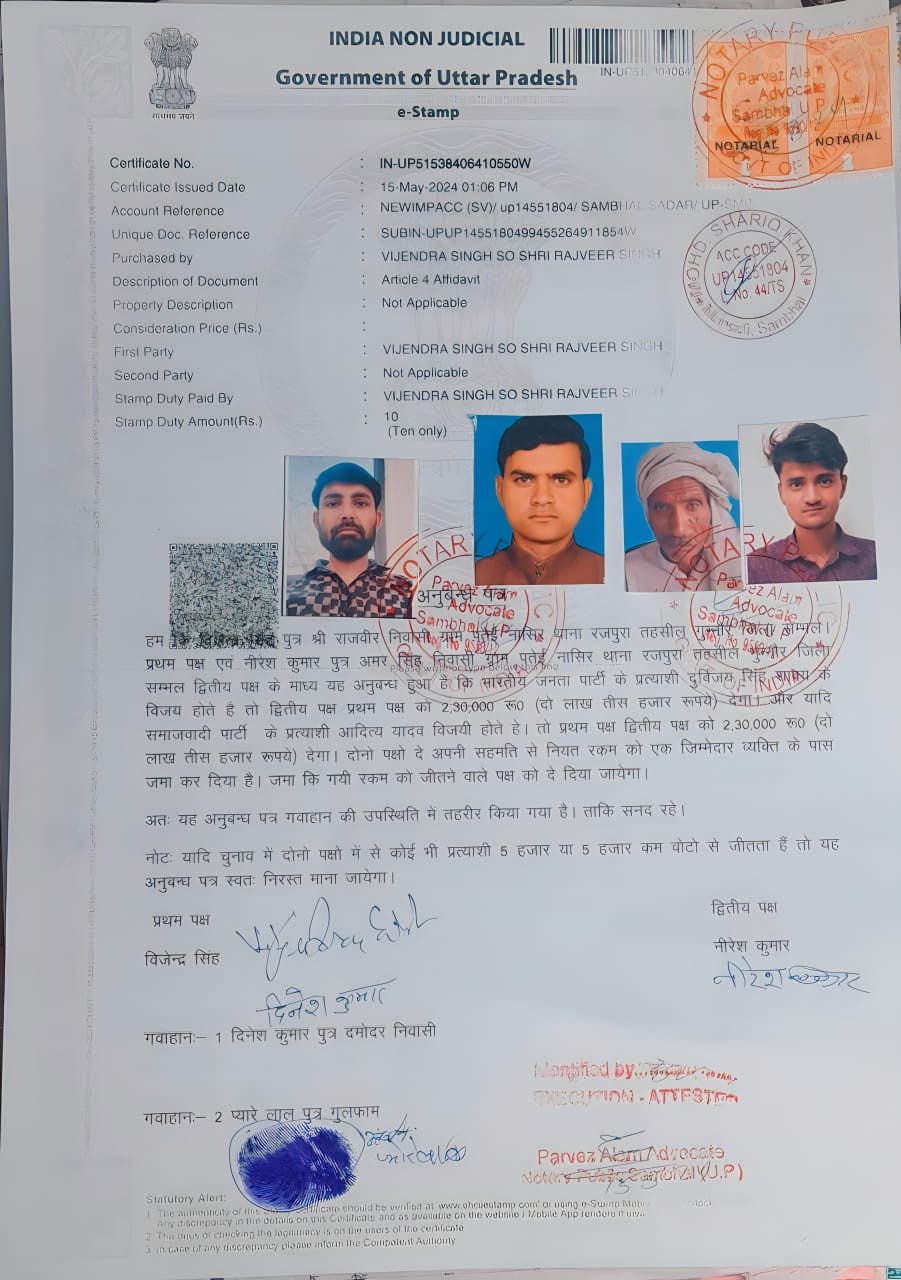 ताजा मामला रजपुरा क्षेत्र का है। यह क्षेत्र बदायूं लोकसभा क्षेत्र के गुन्नौर विधानसभा क्षेत्र का हिस्सा है। ऐसे में यहां भाजपा के प्रत्याशी दुर्विजय सिंह शाक्य और सपा प्रत्याशी आदित्य यादव के जीत हार पर शर्त लगी है। इससे जुड़ा अनुबंध पत्र इंटरनेट मीडिया पर भी प्रसारित हुआ है।