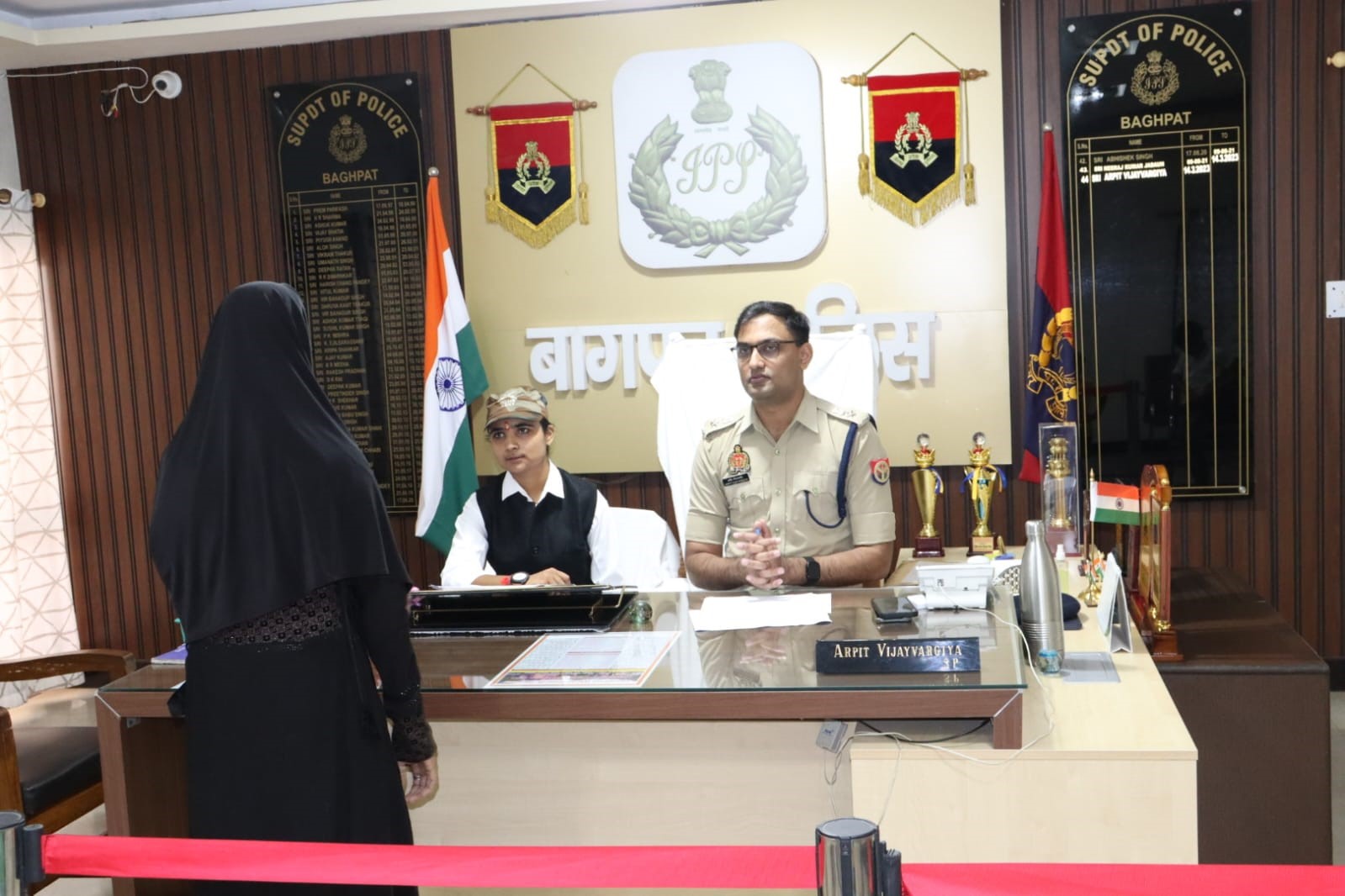 बागपत में एसपी कार्यालय में महिला की समस्या सुनतीं एक दिन के लिए एसपी बनीं सुषमा त्यागी। सौ. पुलिस विभाग