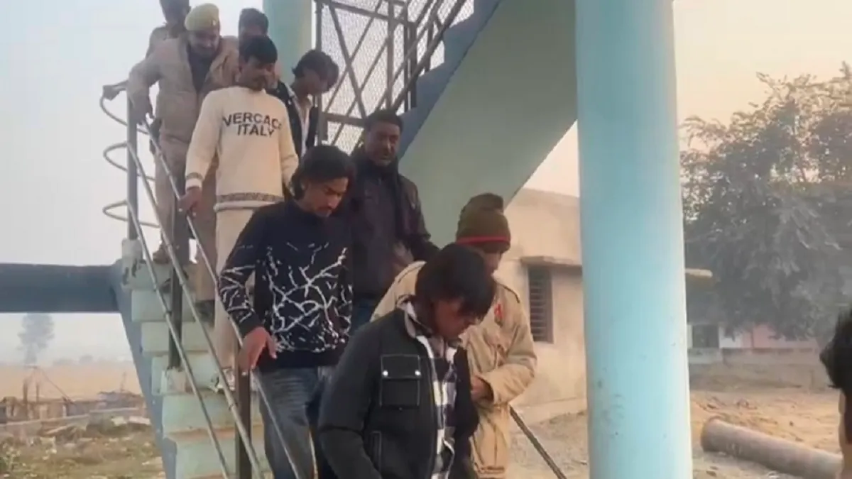 बागपत में टंकी पर चढ़कर रील बना रहे युवकों को पकड़कर लाती पुलिस। वीडियो ग्रैब