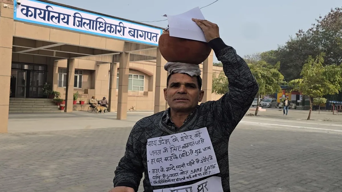 बागपत कलक्ट्रेट में मटके में जल लेकर प्रदर्शन करते सुभाष कश्यप।