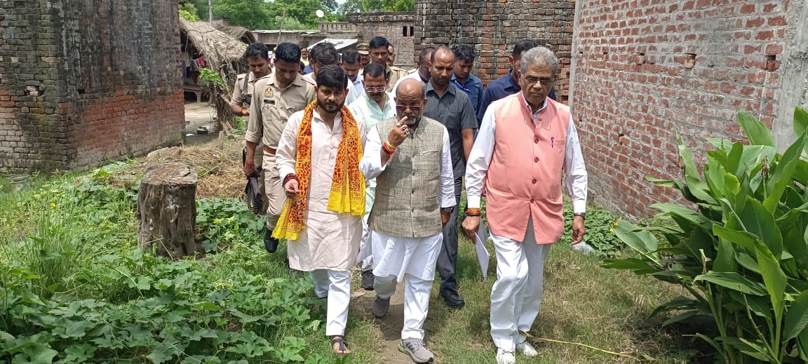 महसी के भेड़िया प्रभावित कोलैला गांव का दौरा करते वन मंत्री डॉ. अरुण कुमार सक्सेना साथ में विधायक सुरेश्वर सिंह व अन्य। जागरण