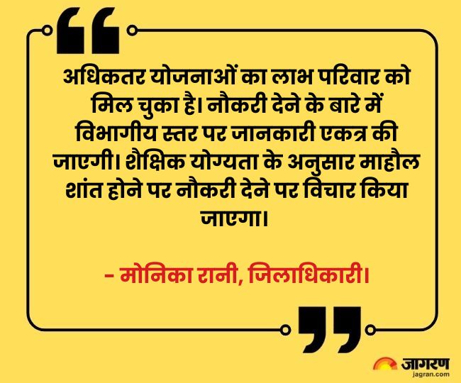 अधिकतर योजनाओं का लाभ परिवार को मिल चुका है। नौकरी देने के बारे में विभागीय स्तर पर जानकारी एकत्र की जाएगी। शैक्षिक योग्यता के अनुसार माहौल शांत होने पर नौकरी देने पर विचार किया जाएगा। - मोनिका रानी, जिलाधिकारी।