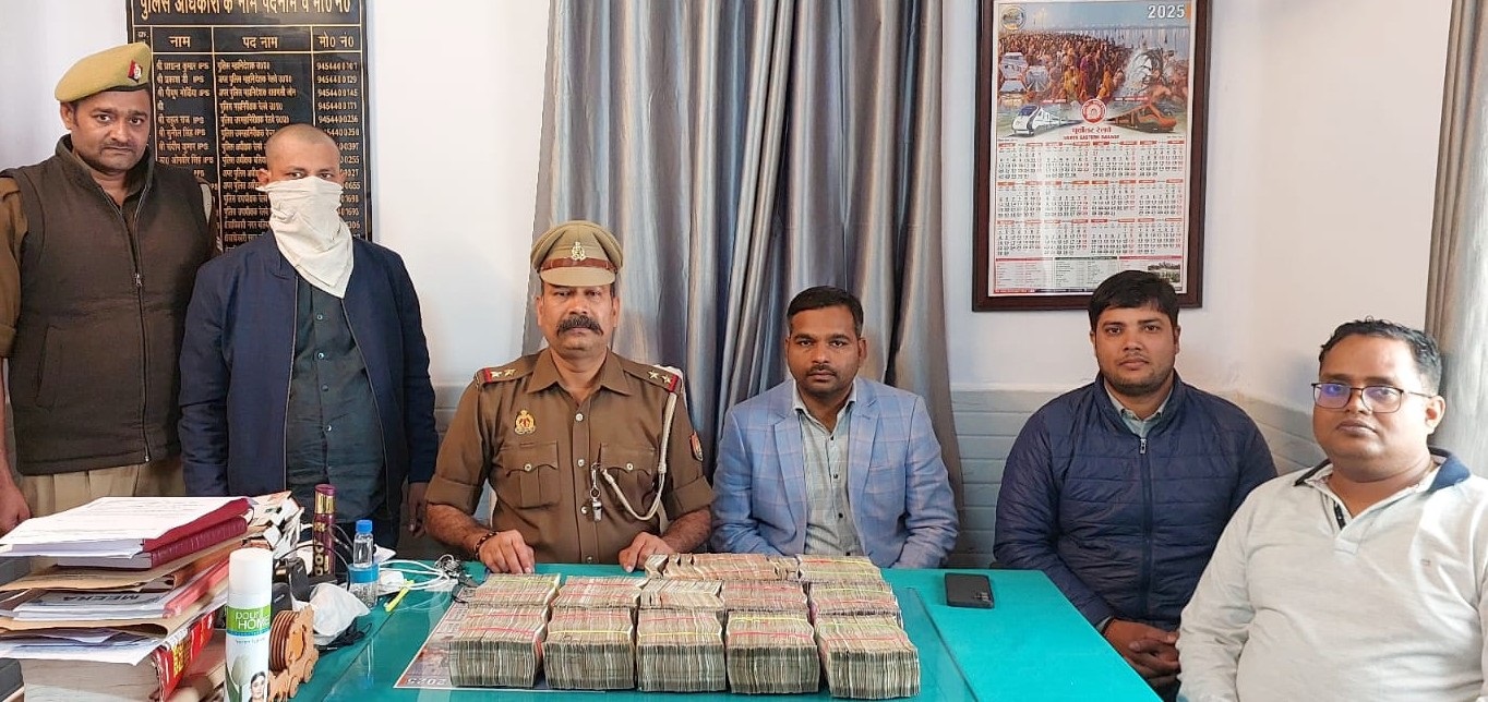 बलिया रेलवे स्टेशन पर तस्कर से बरामद 45 लाख रुपए के साथ जीआरपी और आयकर की टीम।