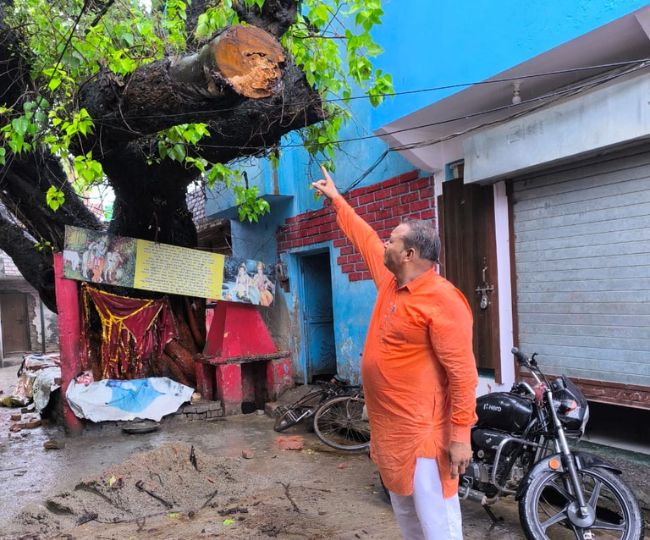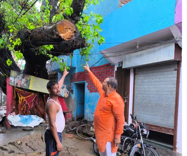 पीपल की सूखी डाल को छांटने से ताजिए का रास्ता बन गया है।