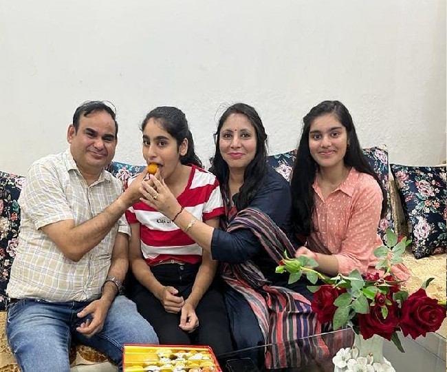 प्रिशा मंगल को मिठाई खिलाते पिता सीए मनोज मंगल व मांं श्वेता मंगल साथ में छोटी बहन पान्या मंगल।