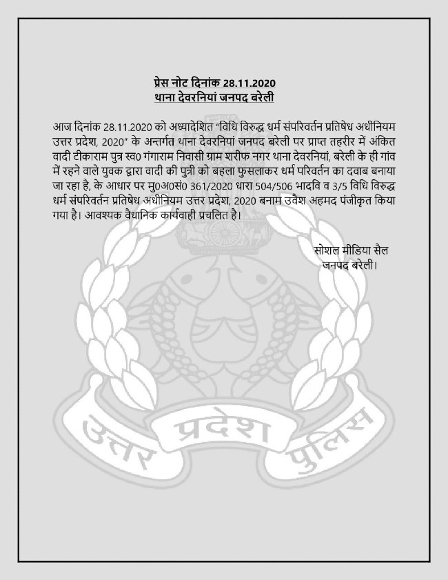 The first case under Uttar Pradesh Prohibition of Unlawful Conversion of Religion Ordinance, 2020 has been registered at Deorania police station in Bareilly wherein a man is accused of trying to forcibly convert a girl's faith & threaten her: Prashant Kumar ADG (Law & Order) https://t.co/UAHEyfOeoy" rel="nofollow pic.twitter.com/zX4gyJkFFd
