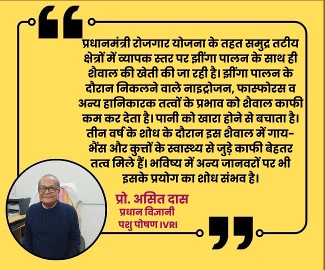 प्रधानमंत्री रोजगार योजना के तहत समुद्र तटीय क्षेत्रों में व्यापक स्तर पर झींगा पालन के साथ ही शैवाल की खेती की जा रही है। झींगा पालन के दौरान निकलने वाले नाइट्रोजन, फास्फोरस व अन्य हानिकारक तत्वों के प्रभाव को शैवाल काफी कम कर देता है। पानी को खारा होने से बचाता है। तीन वर्ष के शोध के दौरान इस शैवाल में गाय-भैंस और कुत्तों के स्वास्थ्य से जुड़े काफी बेहतर तत्व मिले हैं। भविष्य में अन्य जानवरों पर भी इसके प्रयोग का शोध संभव है।