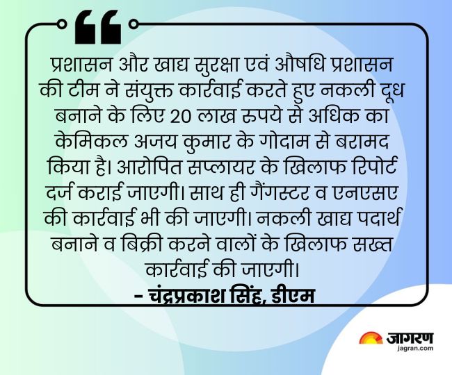 सहायक आयुक्त ने बताया कि गांव का नफीस अहमद पुत्र शमीम खान पनीर बना रहा था। यहां मांग के सापेक्ष नकली पनीर तैयार किया जा रहा था। नफीस ने टीम को बताया कि केमिकल की सप्लाई बुलंदशहर स्थित गोदाम से होती है। टीम तीन लोगों को अपने साथ ले आई। पकड़े लोगों ने कलेक्ट्रेट में एडीएम प्रशासन डा. प्रशांत कुमार के कार्यालय में मिल्क फ्लेवर सिंथेटिक से नकली दूध तैयार कर दिखाया।