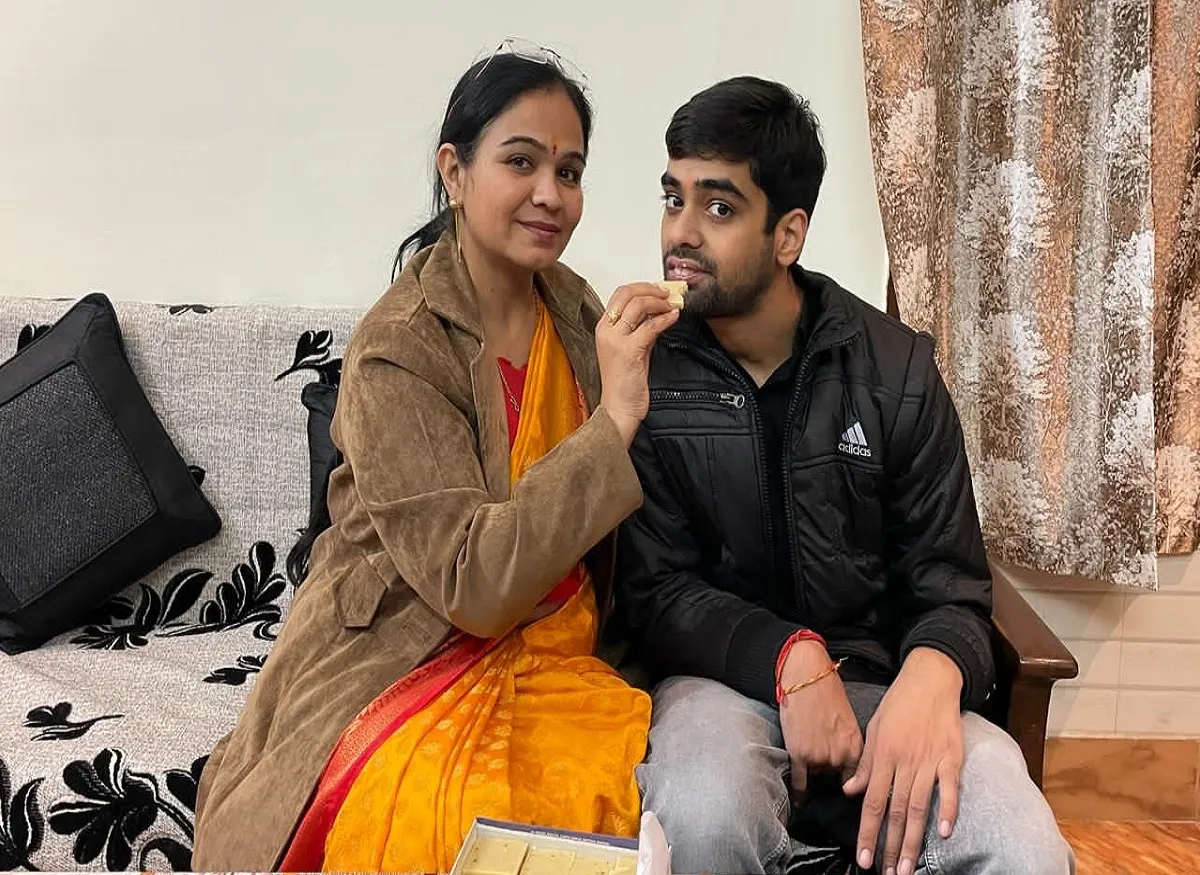 मानवेंद्र को मिठाई खिलातीं माता रेनू सिंह।