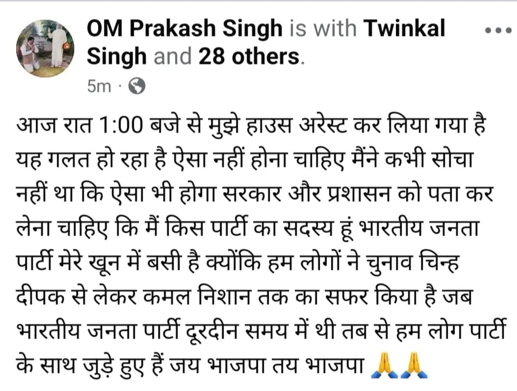 प्रधानमंत्री मोदी के वाराणसी दौरे के दौरान चंदौली पुलिस ने भाजपा कार्यकर्ता ओम प्रकाश सिंह को हाउस अरेस्ट कर दिया। बबुरी पुलिस ने गलती से यह कार्रवाई की जिससे कार्यकर्ता ने सोशल मीडिया पर निराशा व्यक्त की। ओम प्रकाश सिंह ने कहा कि वह हमेशा पार्टी के साथ खड़े रहे हैं।