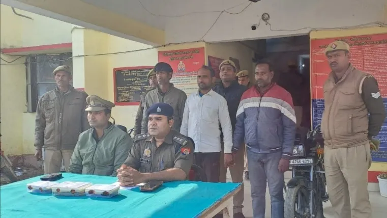 चकिया कोतवाली में पुलिस के साथ गिरफ्तार ठग।