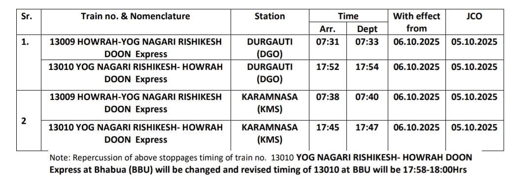 इन स्टेशनों पर यह ठहराव छह अक्टूबर से शुरू होंगे जब पांच अक्टूबर को अपने प्रारंभिक स्टेशन से चलने वाली ट्रेन इन स्टेशनों पर पहुंचेगी। ट्रेन संख्या 13009 हावड़ा व योगनगरी ऋषिकेश दून एक्सप्रेस दुर्गावती स्टेशन पर सुबह 07:31 बजे पहुँचेगी और 07:33 बजे प्रस्थान करेगी। इसी ट्रेन का कर्मनाशा स्टेशन पर आगमन 07:38 बजे होगा और यह 07:40 बजे रवाना होगी।
