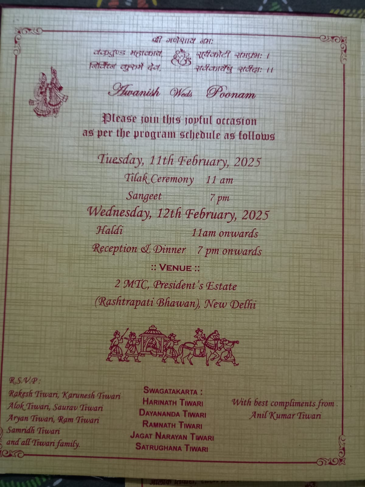 अवनीश एवं पूनम के शादी समारोह में कुल 94 लोगों को आमंत्रित किया गया है। जिसमें 42 बरातियों को राष्ट्रपति भवन के मयूर अपार्टमेंट में ठहरने के लिए इंतजाम किया गया है। इसके अलावा नौ लोगों को कोटा हाउस में तथा 19 लोगों को न्यू डेलही 6 बीएचके में ठहरने का इंतजाम किया गया है। इसके साथ ही सात लोगों को एक बीएचके आउटसाइड में ठहरने का व्यवस्था दिया गया है। आमंत्रित अतिथियों की जांच पड़ताल के साथ उनका मोबाइल नंबर व आधार कार्ड नंबर भी सूची में जारी किया गया है।