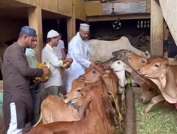 सुबह पौने आठ बजे ईदगाह में नमाज अदा करने के लिए मंच के राष्ट्रीय उपाध्यक्ष हसन कादरी के नेतृत्व में पदाधिकारी गांधी पार्क स्थित गौशाला पहुंचे। सबसे पहले उन्होंने गोवंशी को पुष्पमाला पहनाई। इसके बाद केले खिलाए।