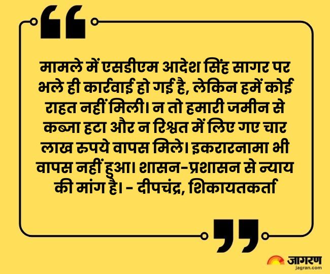 मामला मक्खनपुर क्षेत्र के गांव जसलई का था। गांव मुहम्मदपुर नबादा निवासी दीपचंद्र ने मार्च-अप्रैल में शिकोहाबाद के तत्कालीन एसडीएम आदेश सिंह सागर से जसलई स्थित कृषि भूमि पर कुछ लोगों द्वारा कब्जा करने की शिकायत की थी। जुलाई में दीपचंद्र ने शपथ पत्र देते हुए डीएम रमेश रंजन से कहा कि जमीन को कब्जा मुक्त कराने के नाम पर एसडीएम ने उससे 15 लाख रुपये मांगे। रुपये न होने पर चार लाख रुपये नकद लिए और जमीन के कुछ हिस्से का इकरारनामा तहसील में तैनात संविदाकर्मी हर्ष कुमार के नाम कराया। इसके बाद भी कब्जा नहीं हटा। दीपचंद्र ने बताया कि तहसील से हटने के बाद भी एसडीएम ने रुपये नहीं लौटाए।
