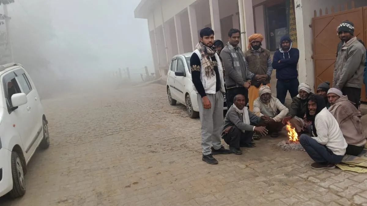 कोहरे और ठंड में अलाव के सहारे लोग। जागरण