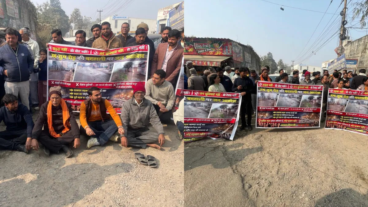 हम तुम रोड की बदहाली के खिलाफ सात सोसाइटियों का धरना प्रदर्शन, प्रशासन से तत्काल मरम्मत की मांग