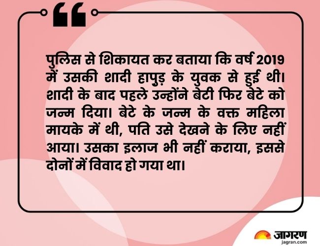 सिहानी गेट थानाक्षेत्र में रहने वाली युवती ने 22 दिसंबर को पुलिस से शिकायत कर बताया कि वर्ष 2019 में उसकी शादी हापु़ड़ के युवक से हुई थी। शादी के बाद पहले उन्होंने बेटी फिर बेटे को जन्म दिया। बेटे के जन्म के वक्त महिला मायके में थी, पति उसे देखने के लिए नहीं आया। उसका इलाज भी नहीं कराया, इससे दोनों में विवाद हो गया था।