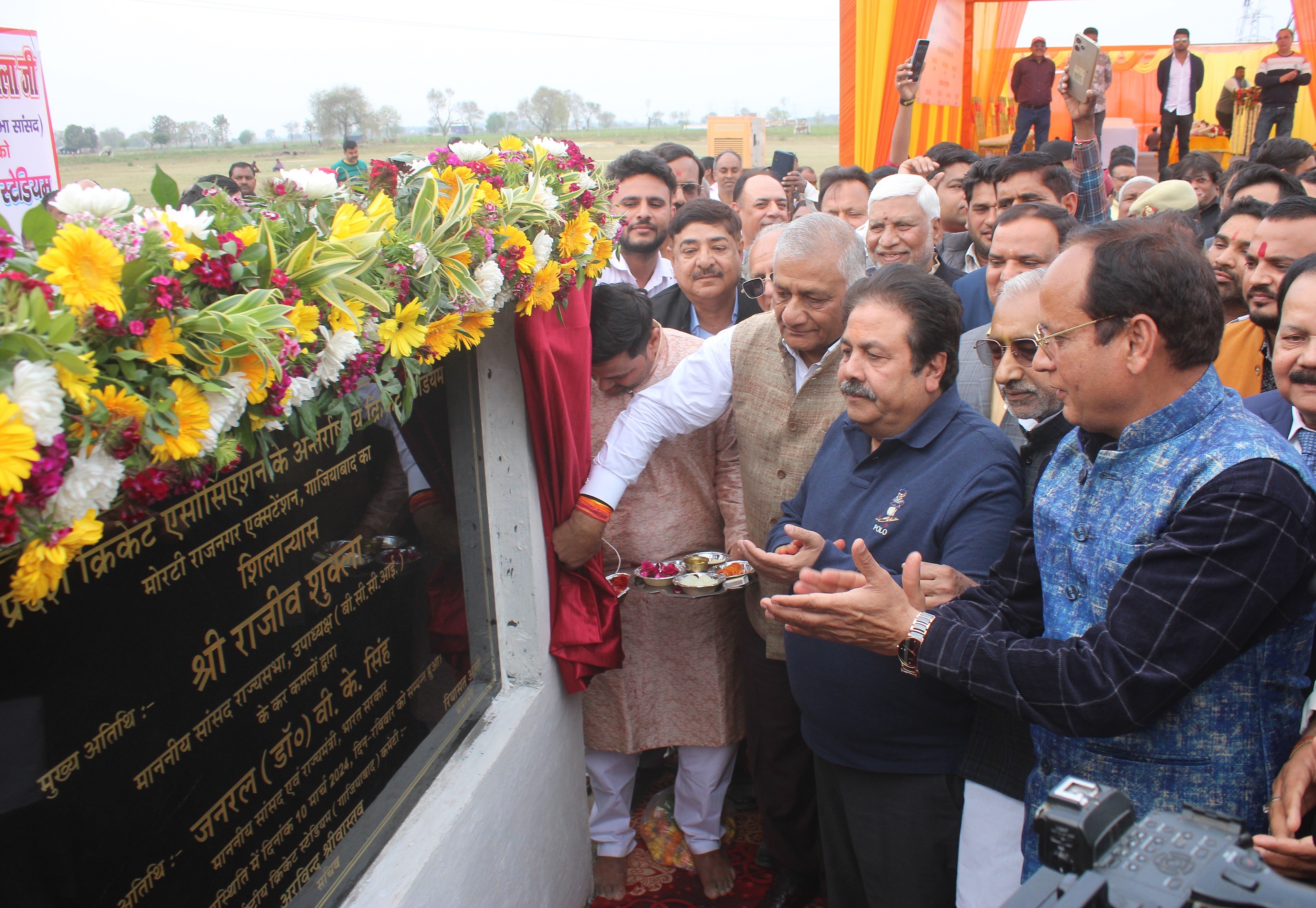 राजनगर एक्सटेंशन स्थित अंतरराष्ट्रीय क्रिकेट स्टेडियम का शिलान्यास करते बीसीसीआई उपाध्यक्ष राजीव शुक्ला व केंद्रीय राज्यमंत्री वीके सिंह।