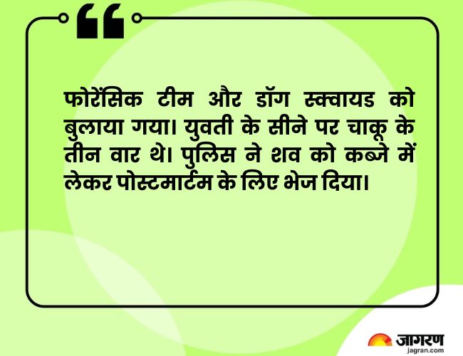 इसके बाद फाेरेंसिक टीम और डॉग स्क्वायड को बुलाया गया। सीने पर चाकू के तीन वार थे। पुलिस ने शव को कब्जे में लेकर पोस्टमार्टम के लिए भेज दिया। फाेटो के माध्यम से युवती की पहचान के प्रयास शुरू किए। आसपास के लोगों से पूछताछ की गई। पार्क में घूमने आने वाले लोगों से भी जानकारी की गई, लेकिन देर शाम तक युवती की शिनाख्त नहीं हो सकी। युवती की उम्र करीब 25 वर्ष है।