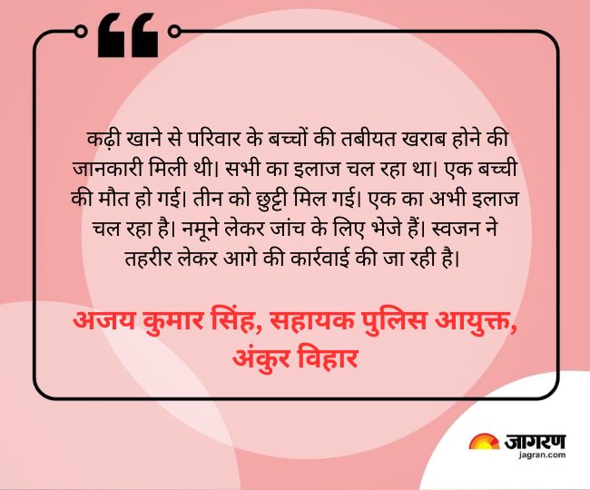 कढ़ी खाने से परिवार के बच्चों की तबीयत खराब होने की जानकारी मिली थी। सभी का इलाज चल रहा था। एक बच्ची की मौत हो गई। तीन को छुट्टी मिल गई। एक का अभी इलाज चल रहा है। नमूने लेकर जांच के लिए भेजे हैं। स्वजन ने तहरीर लेकर आगे की कार्रवाई की जा रही है। - अजय कुमार सिंह, सहायक पुलिस आयुक्त, अंकुर विहार