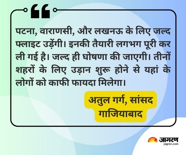 इस संबंध में गाजियाबाद के सांसद अतुल गर्ग ने कहा कि पटना, वाराणसी, और लखनऊ के लिए जल्द फ्लाइट उड़ेंगी। इनकी तैयारी लगभग पूरी कर ली गई है। जल्द ही घोषणा की जाएगी। तीनों शहरों के लिए उड़ान शुरू होने से यहां के लोगों को काफी फायदा मिलेगा।