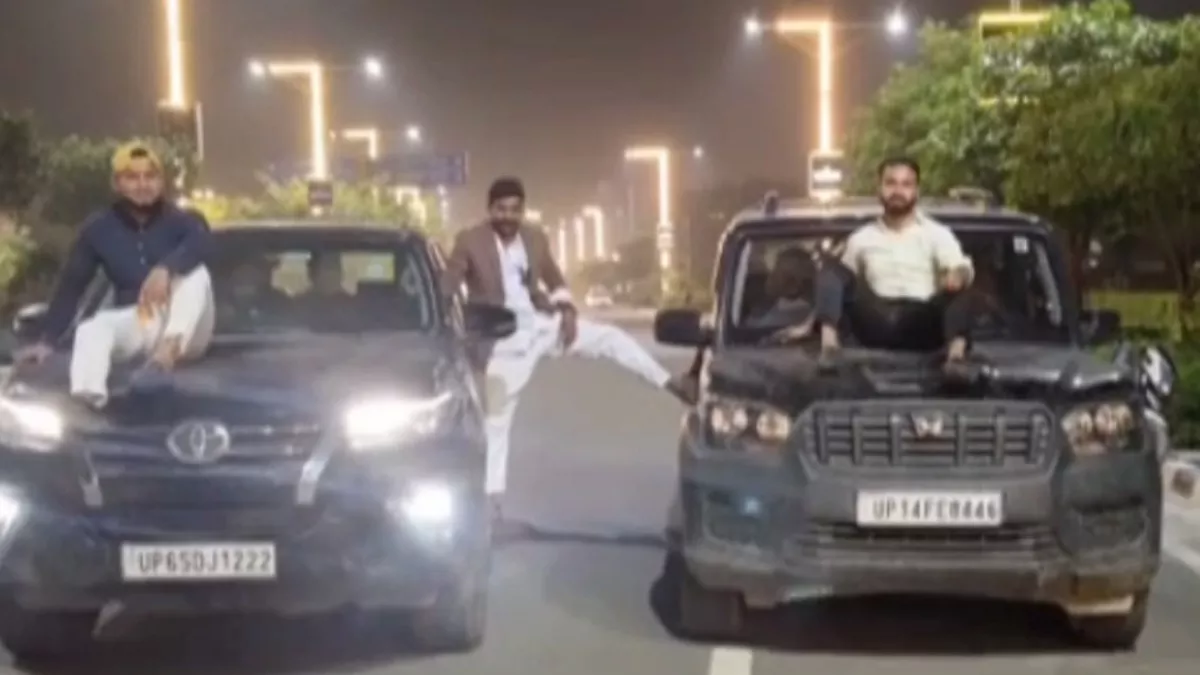 वीडियो में देखा जा सकता है कि दो युवक कार के बोनट पर बैठे हैं, जबकि एक युवक चलती हुई दोनों कारों पर पैर रखकर खड़ा है। वीडियो थाना वेव सिटी के पास मुख्य मार्ग का बताया जा रहा है।