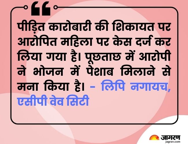पीड़ित कारोबारी की शिकायत पर आरोपित महिला पर केस दर्ज कर लिया गया है। पूछताछ में आरोपित ने भोजन में पेशाब मिलाने से मना किया है। मामले की जांच की जा रही है। - लिपि नगायच, एसीपी वेव सिटी