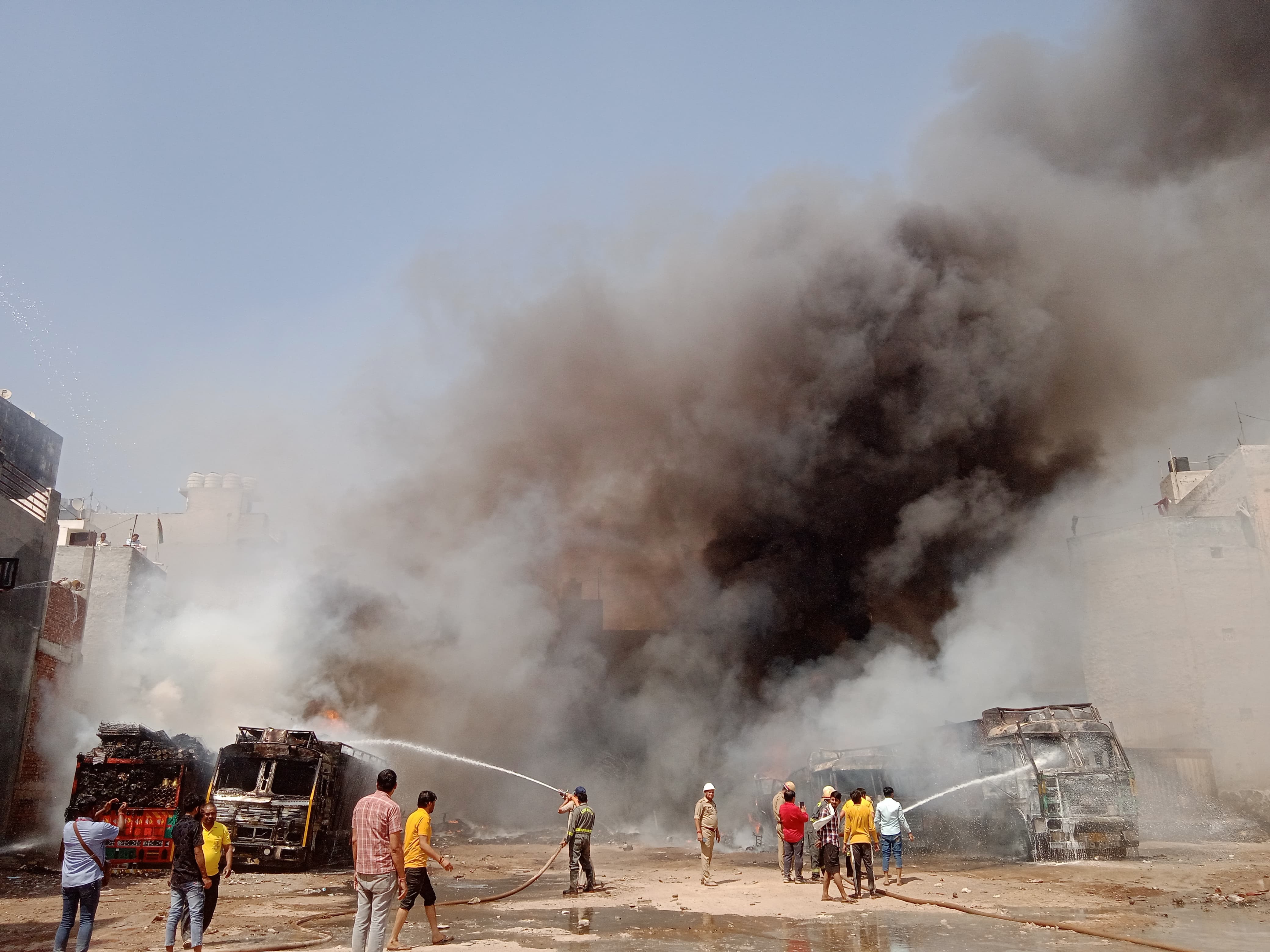 साहिबाबाद कोतवाली क्षेत्र के वृंदावन गार्डन में पार्किंग में खड़े ट्रकों में भी आग लग गई। वहीं, आग की सूचना पर अग्निशमन कर्मी मौके पर पहुंचे और आग बुझाने में जुटे हुए हैं।
