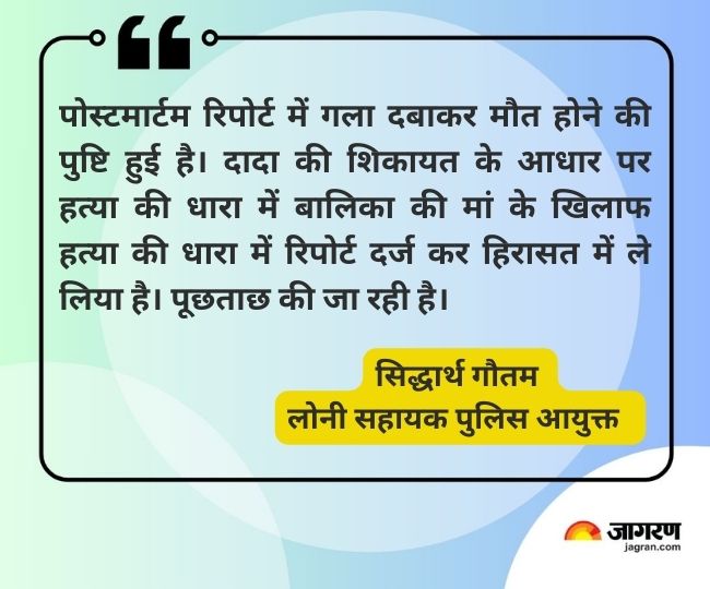 इस संबंध में लोनी सहायक पुलिस आयुक्त सिद्धार्थ गौतम ने कहा कि पोस्टमार्टम रिपोर्ट में गला दबाकर मौत होने की पुष्टि हुई है। दादा की शिकायत के आधार पर हत्या की धारा में बालिका की मां के खिलाफ हत्या की धारा में रिपोर्ट दर्ज कर हिरासत में ले लिया है। पूछताछ की जा रही है।
