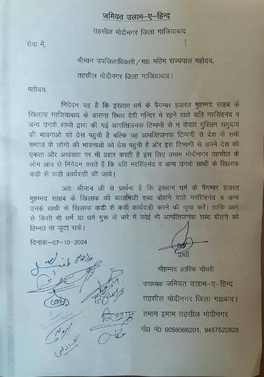 यति नरसिंहानंद के विवादित बयान के बाद मुस्लिम समाज में आक्रोश व्याप्त है। जमीयत उलामा-ए-हिंद के बैनर तले बड़ी संख्या में मुस्लिम समाज के लोग मोदीनगर तहसील पहुंचे और धरने पर बैठ गए। लोगों ने यति नरसिंहानंद के खिलाफ कड़ी कार्रवाई की मांग की और पुलिस के खिलाफ नारेबाजी भी की। एसडीएम और एसीपी उन्हें समझाने में जुटे हैं लेकिन लोग तहसील में ही धरने पर बैठे हैं।