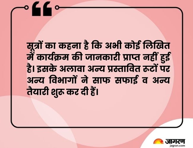 यातायात और सुरक्षा की दृष्टि से पुलिस के अधिकारी खाका तैयार कर रहे हैं। खुफिया एजेंसियां भी तैयारी में लगी हैं। हालांकि, अभी इस पर मुहर नहीं लगी है। सूत्रों का कहना है कि अभी कोई लिखित में कार्यक्रम की जानकारी प्राप्त नहीं हुई है। इसके अलावा अन्य प्रस्तावित रूटों पर अन्य विभागों ने साफ सफाई व अन्य तैयारी शुरू कर दी हैं।