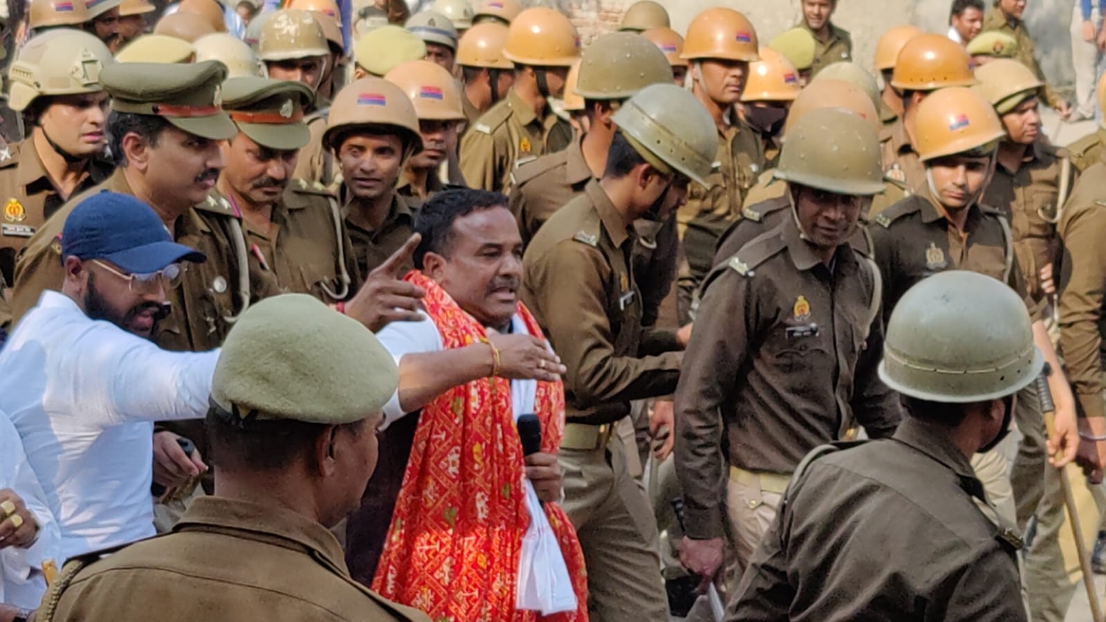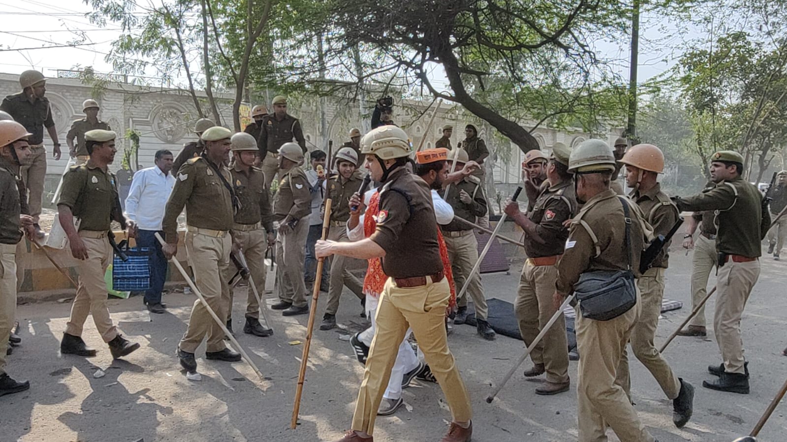पुलिस ने सभी लोगों को रोक रखा है, लेकिन बाद में सभी लोग हॉल के बाहर आकर धरने पर बैठ गए। फिर पुलिस ने सबको खदेड़ दिया। भारी पुलिस बल और पीएसी की तैनाती की गई है।