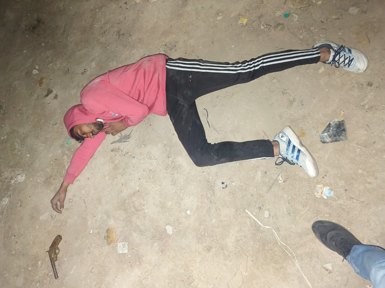 (पुलिस मुठभेड़ में घायल होने के बाद जमीन पर पड़ा बदमाश। जागरण फोटो)